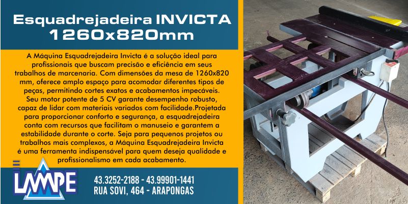 A Máquina Esquadrejadeira Invicta é a solução ideal para profissionais que buscam precisão e eficiência em seus trabalhos de marcenaria. Com dimensões da mesa de 1260x820 mm, oferece amplo espaço para acomodar diferentes tipos de peças, permitindo cortes exatos e acabamentos impecáveis. Seu motor potente de 5 CV garante desempenho robusto, capaz de lidar com materiais variados com facilidade.