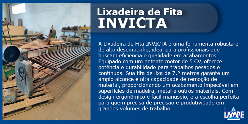 A Lixadeira de Fita INVICTA é uma ferramenta robusta e de alto desempenho, ideal para profissionais que buscam eficiência e qualidade em acabamentos. Equipado com um potente motor de 5 CV, oferece potência e durabilidade para trabalhos pesados e contínuos. Sua fita de lixa de 7,2 metros garante um amplo alcance e alta capacidade de remoção de material, proporcionando um acabamento impecável em superfícies de madeira, metal e outros materiais. Com design ergonômico e fácil manuseio, é a escolha perfeita para quem precisa de precisão e produtividade em grandes volumes de trabalho.